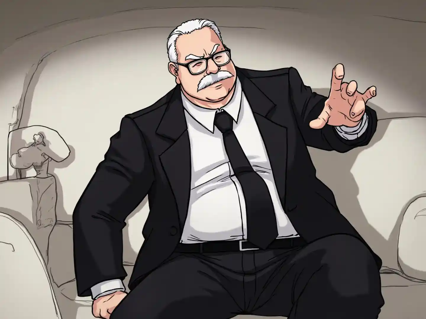 MichaelUm homem, gordo, diretor, cabelo branco, cabelo muito curto, bigode de Hitler, fato, camisa branca, óculos, óculos opacos, gravata preta - Em um joelho