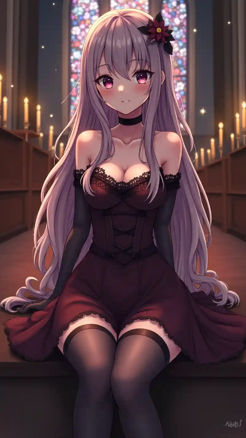 Imagem em grande escala de uma garota de anime Ultra HD, encantadoramente bonita e divina, brilhando sob a luz de velas suaves, sentada em uma catedral gótica interior com janelas de vidro, usando um vestido Lolita escuro com um top de espartilho e meias de altura da coxa, seu cabelo longo adornado com um véu de renda e um sorriso sufocante, olhos largos, pele brilhante, paleta de cores roxas e profundas, traços suaves, maquiagem ous, vibrações sagradas e etéreas, iluminação com um brilho suave, acentuando seu charmoso, peito bem definido com uma decoração sutil, e longas, tonificadas com uma postura equilibrado, irradiando todo o e e e e e e e e e e e e e e e e e e e e e e e e e e e e e e e e e e