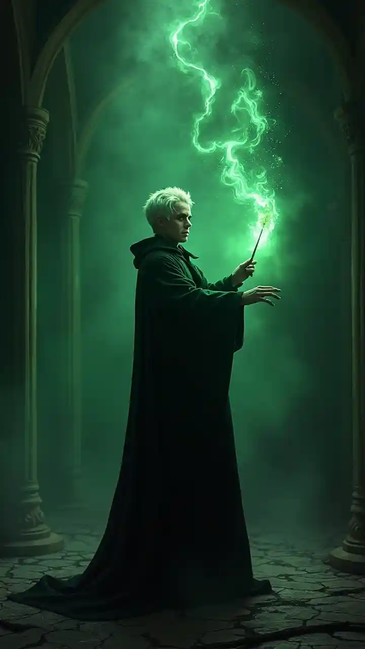 Draco Malfoy lança um feitiço verde com a varinha num salão escuro, gótico, arte digital
