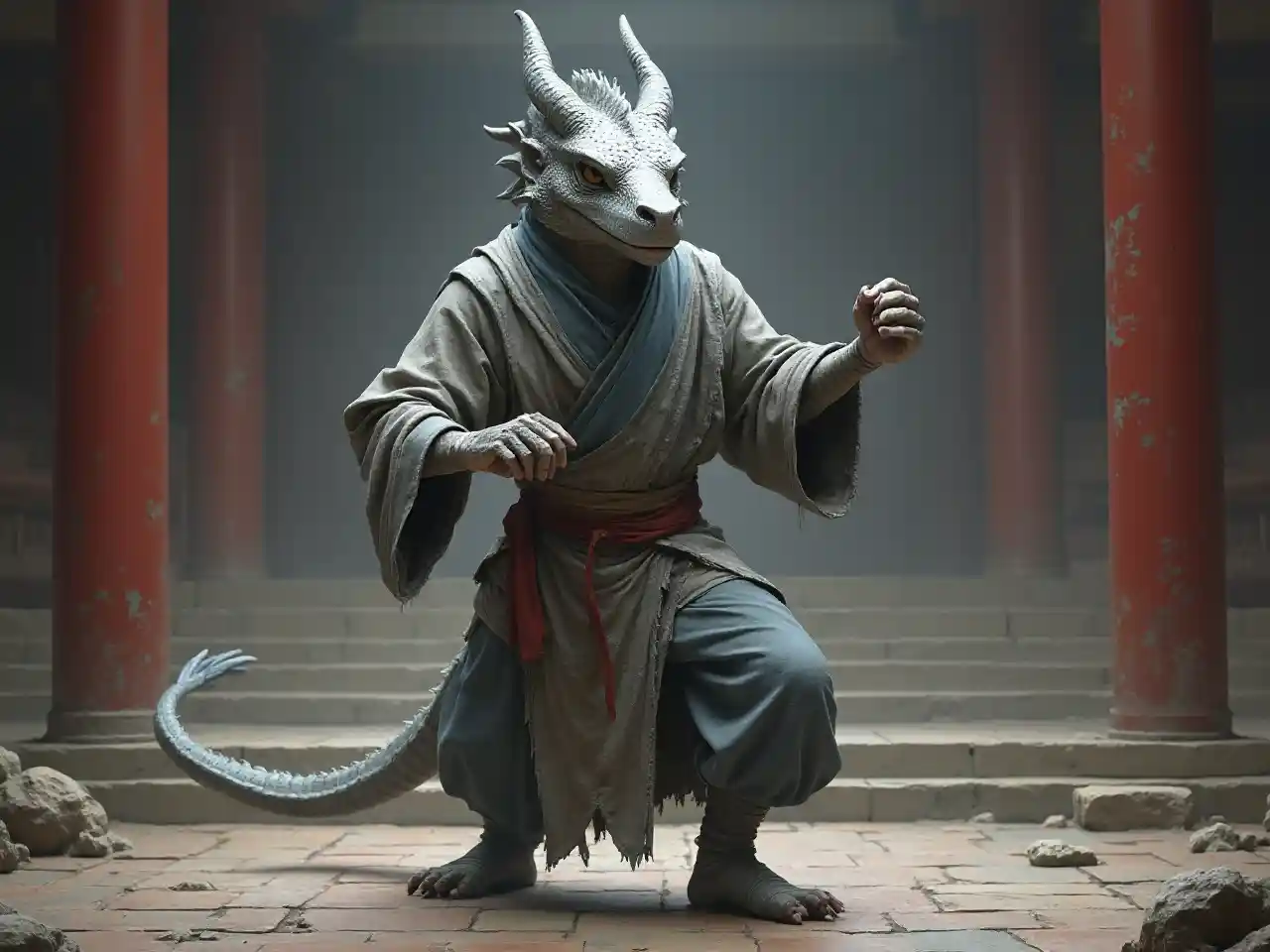 Um monge de prata nascido de dragão numa pose de artes marciais num templo.