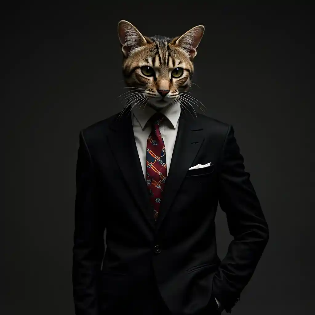 Retrato de corpo inteiro de um gato com um terno preto e curto e uma gravata colorida, que lembra as calças americanas clássicas e uma moda moderna e elegante em preto e branco, misturando inspiração de iluminação cinematográfica e moda vintage. A cena é capturada com uma lente de alta resolução e grande espessura, com um olho meticuloso para os detalhes, enfatizando os detalhes complexos do terno. A iluminação é excepcionalmente avançada e excepcionalmente detalhada, criando um jogo perfeito de luz e sombra que traz a textura e a profundidade da roupa. O visual é clássico e moderno, capturando perfeitamente a essência de um sofisticado cavalheiro americano. 8K, HD, ultra qualidade, detalhes complexos, iluminação cinematográfica, cores vibrantes, alto contraste