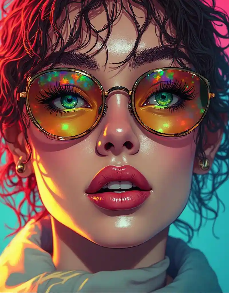 JacobImpressionante ilustração de um próximo de uma mulher elegante e atraente usando óculos espelhos que refletem um arco-íris de cores vibrantes. Como uma sessão de fotos de alta moda,