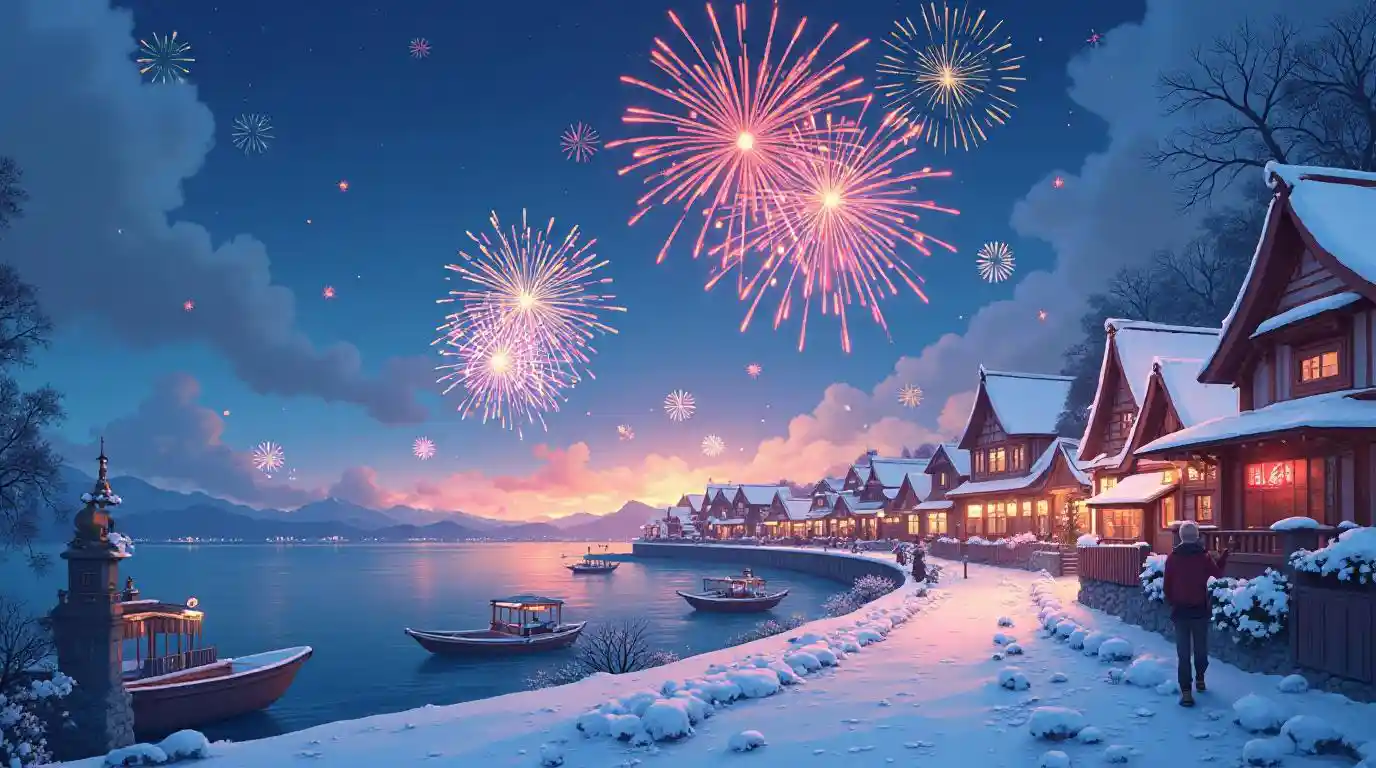 Winter festival in a coastal town, fireworks and dragon parades, in a festive anime style.