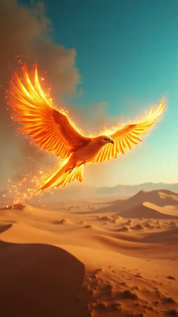 pássaro voando com uma trilha dramática de fogo, vasta paisagem desértica, dunas douradas, intensas chamas laranja e vermelha, contraste com o céu azul, atmosfera cinematográfica, desfoque de movimento de alta energia, brasas brilhantes, ultra detalhado, alta resolução 4K, uma sensação de liberdade e emoção, imagens cativas e poderosas.