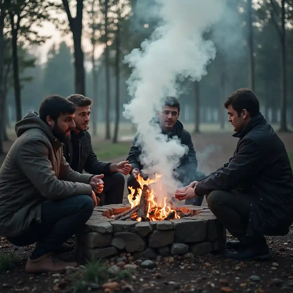 IsabellaUm grupo de homens sentados em torno de um fogão com muita fumaça saindo dele e um fogo no meio, Daryush Shokof, incoerentes, fotografia de retrato, uma foto de stock