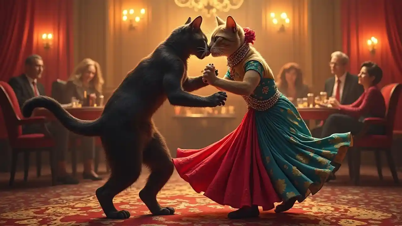 HenryDois gatos a dançar flamenco apaixonadamente numa sala de baile, fotorealistas, com cores vivas, com cores de contraste, com detalhes