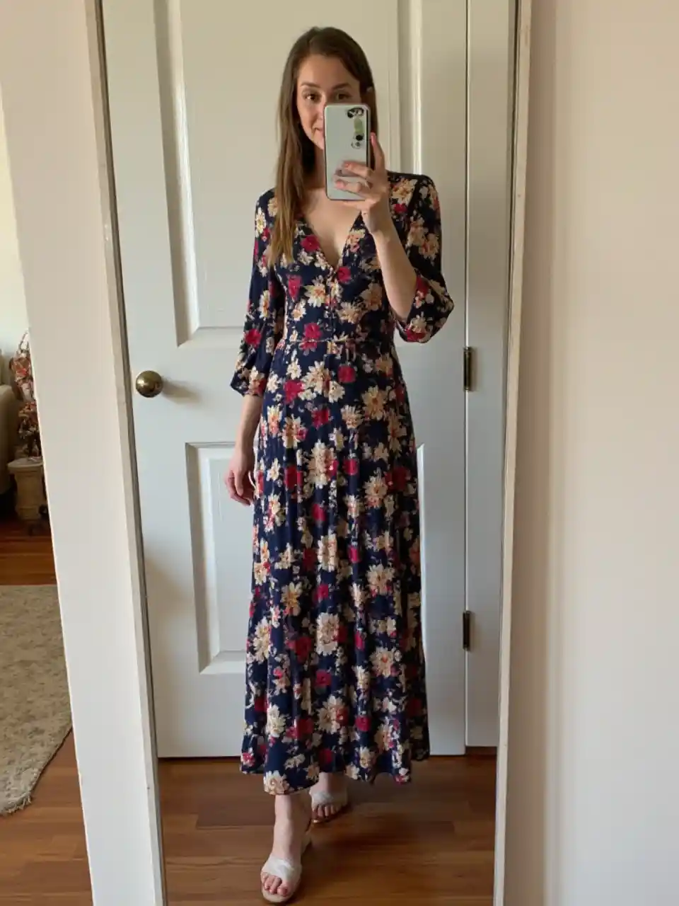 NathanUma mulher em um vestido de flores tira uma selfie no espelho de um quarto.