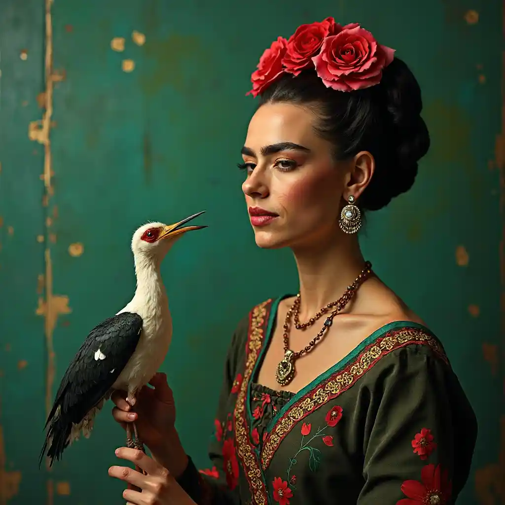 personagem real, em hiperrealismo de Frida Kahlo com coroa de flores, vestido tradicional mexicano que gera contraste com o fundo de uma parede de cor verde escuro, acessórios chamativos e com todas as características que representam uma Frida Kahlo olhando um colibri. personagem com maior semelhança ao personagem real