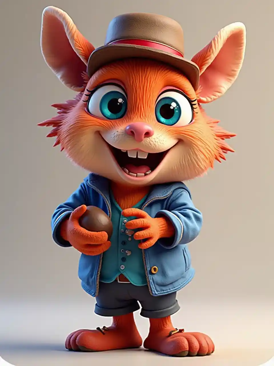 Mascote de rã 3D da Pixar com olhos azuis e chapéu vermelho