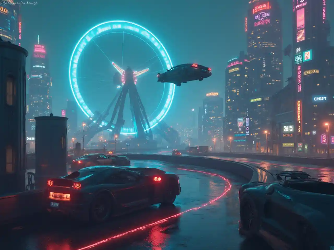 LaylaE a IA gerou imagens futuristas de carros voadores, arranha-céus verdes e luzes de neon.
