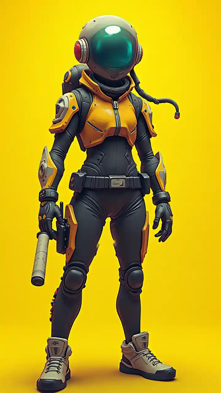 jogo de computador futurista personagem ilustrado em fundo amarelo