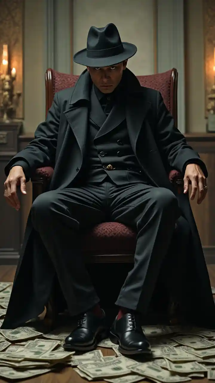 Um gangster japonês sentado em cima do dinheiro com a cadeira
