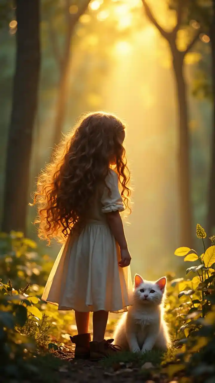 MilaUma menina de 5 anos com cabelo encaracolado e vestido , de pé numa floresta mágica , com um gatinho branco , na luz dourado