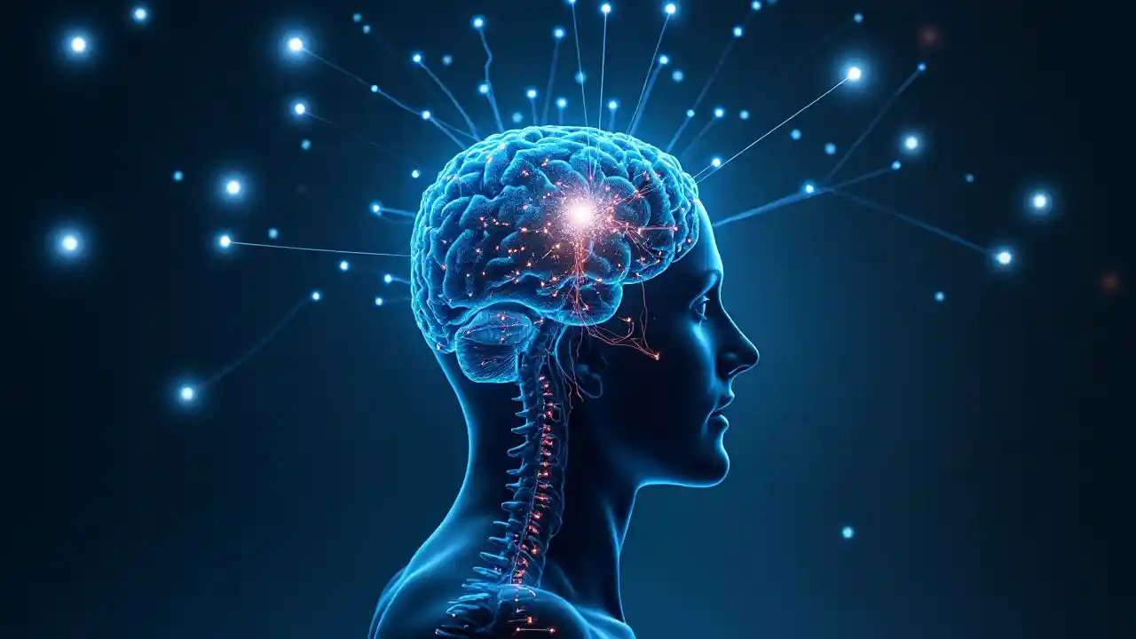 MilaProcesso de pensamento iluminado, palco central do cérebro, mecanismos interligados, iluminação de estúdio com um toque de azul