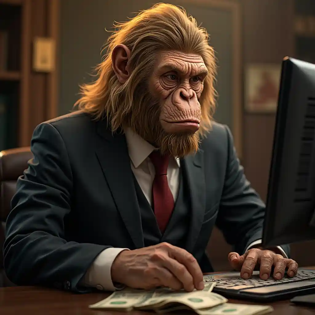 Um Macaco de Ouro em Um Traje Jogando Com Dinheiro Em Frente A Um Computador