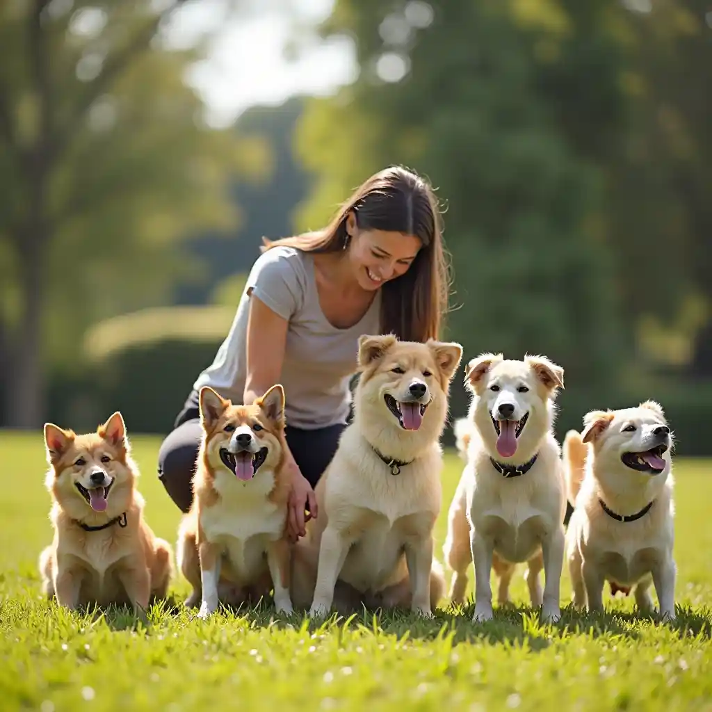 CalebSeis cães felizes treinando com uma treinadora num dia ensolarado