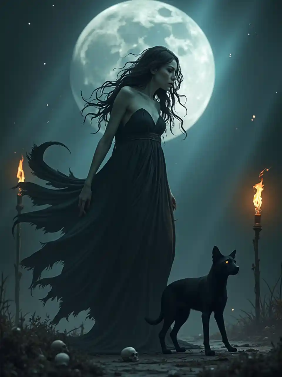 Numa atmosfera mística e iluminada pela lua, a poderosa Deusa Hecate é retratada no meio da transformação, seu corpo contornando-se graciosamente em um gato preto, seus olhos brilham com uma intensidade de outro mundo. A pele dela tem um brilho suave e luminescente, como se irradiasse uma aura de magia e mistério. O ar está cheio de uma luz nebulosa e etérea, com sutil luz das estrelas e o fraco cheiro de ervas e plantas venenosas. No fundo, as tochas gêmeas piscam com uma chama quente e dourada, lançando um brilho assustador sobre o ambiente. Algumas chaves e crânios estão espalhados ao redor dela, símbolos de seu domínio sobre o submundo e seu domínio da magia e necromancia. Uma cãozinha negra e um gato-polo ao seu lado, familiares leais e guardiões do seu reino místico. O clima geral é de maravilha mística e onírica, capturando a essência desta complexa deusa tripla, donzela, mãe e.