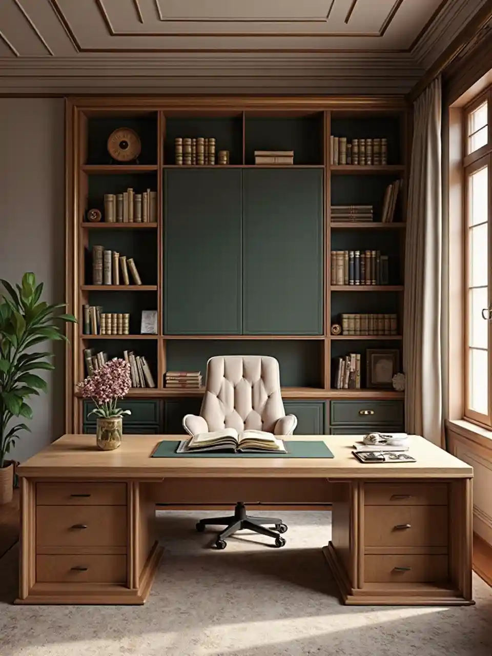 Crie um design para ferramentas de papelada de luxo com um tema de herança que combina estilos emirados e ingleses, usando cores claras, elegantes e tradicionais, em um escritório de luxo semelhante a uma sala de biblioteca de 6x8.