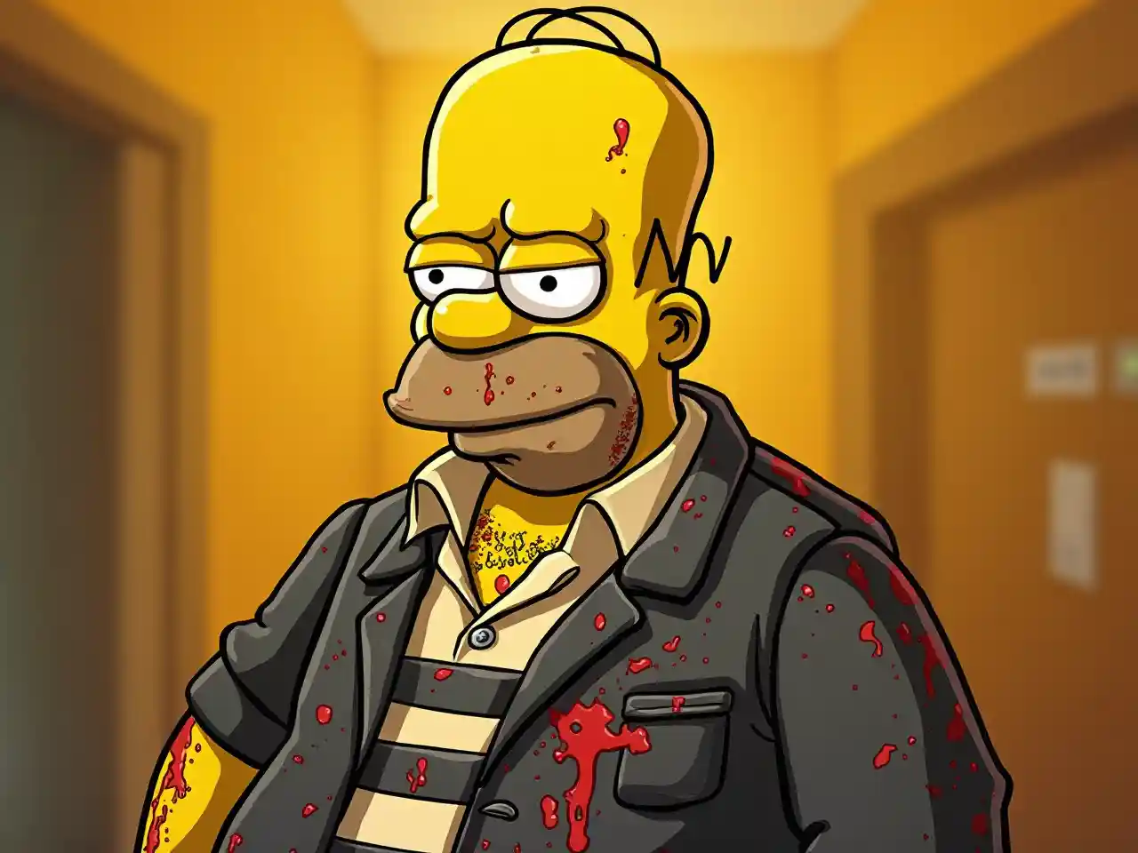 Homer Simpson, estilo dos Simpsons, cores amarelas, largura da linha, criminoso, sangue, nevoeiro, tatuagem no rosto, desenho animado, homem gordo