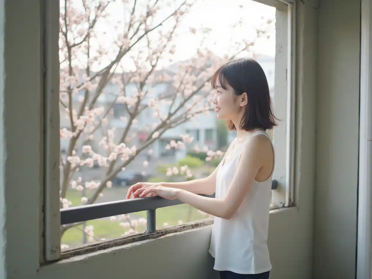 (Visão completa do corpo) Camisa branca sem mangas, uma menina japonesa de 22 anos, de pés descalços, de pé na varanda da sua casa em vários lugares. Ela tem traços faciais delicados. Seus dois braços repousam relaxadamente sobre as grades. Ela gosta da vista do lado de fora. Localizado em uma área residencial de uma pequena cidade no subúrbio do Japão, com flores de sakura. Hora da manhã, calma e atmosfera pacífica.