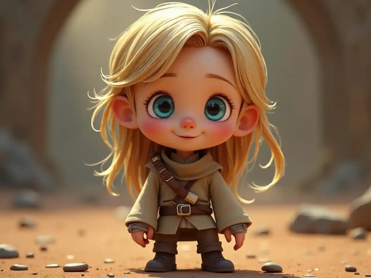 um menino de 7 anos de idade aventureiro semelhante a Jedi de Starwars, universo Starwars, criativo, e pessoa de bom coração com cabelo longo, loiro, olhos azuis grandes, nariz pequeno, e uma boca sorridente, de pé centrado no estilo 3D, renderizado usando a bela animação Disney, estilo Pixar, estilo Disney, estilo 3D