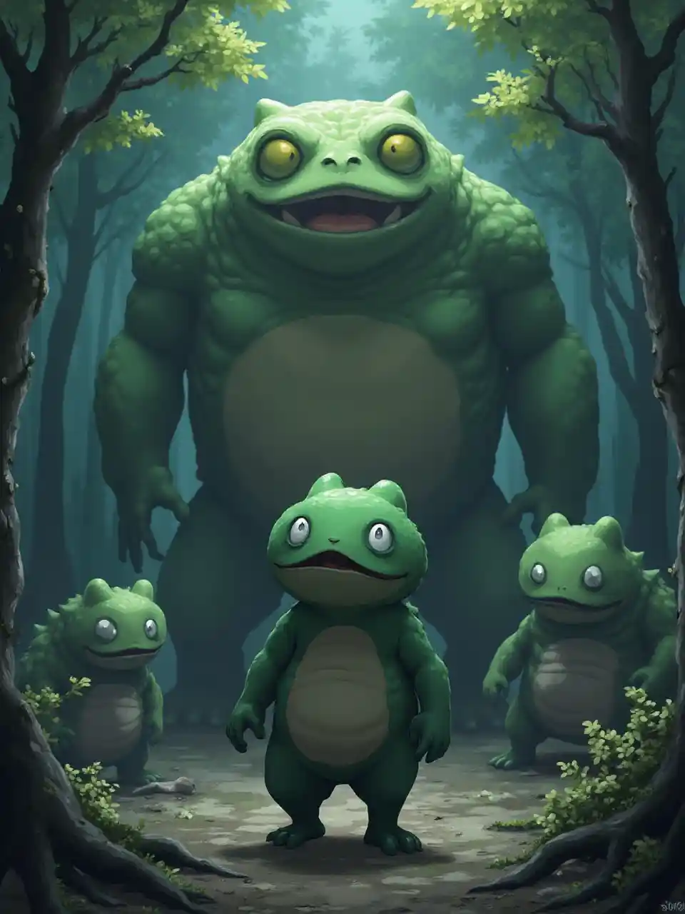 Jiraiya está no Modo Sábio com dois grandes sapos e um chefe de sapo gigante atrás dele em uma clareira escura.