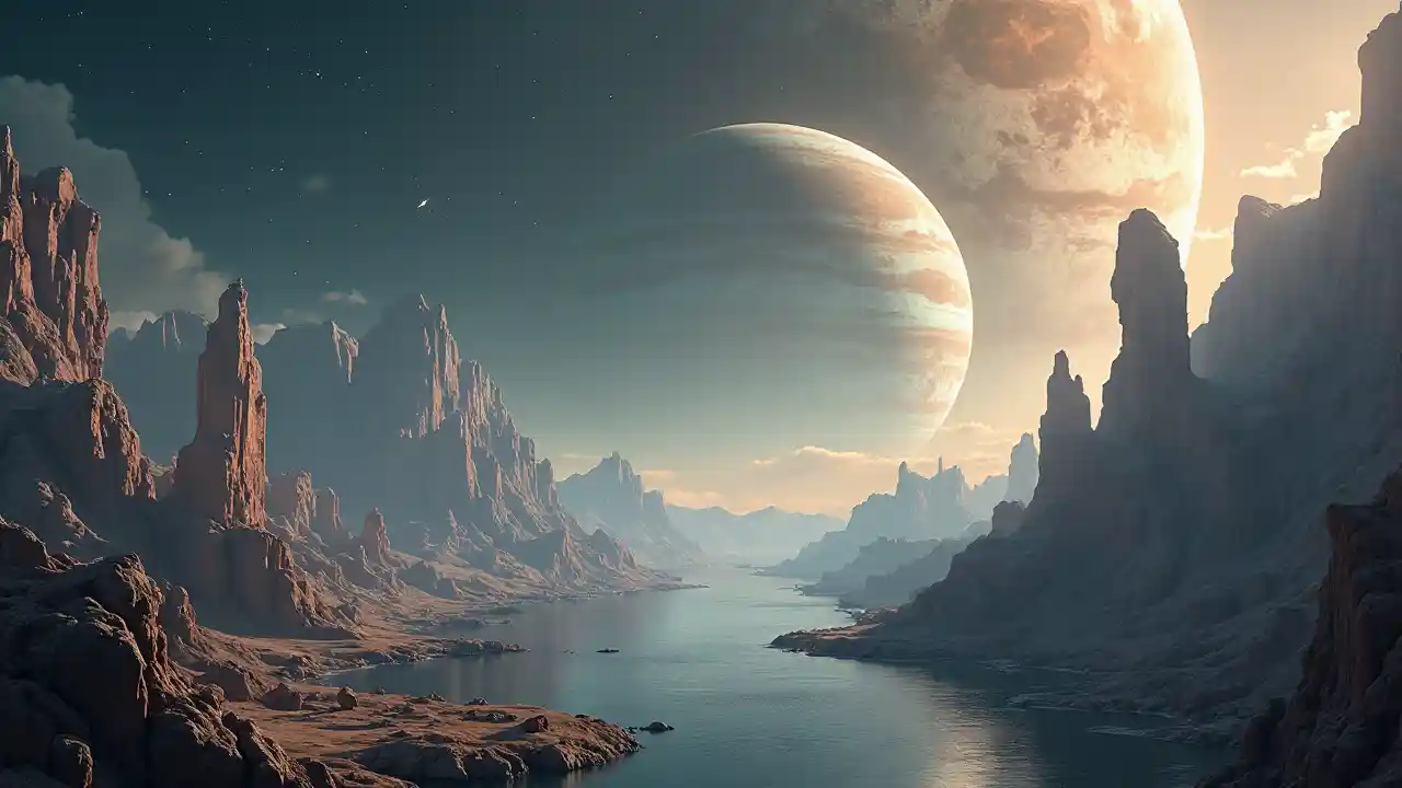 Uma cidade futurista numa lua terraformada de Júpiter, Júpiter é o céu