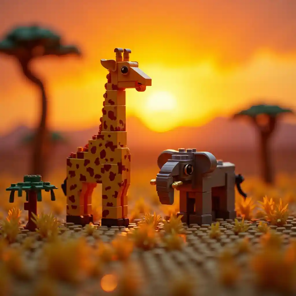 Ultra-realista, Uma savana africana estilizada feita inteiramente de tijolos Lego, com uma girafa Lego alta e um grande elefante Lego de pé lado. A paisagem inclui árvores de acacia Lego, grama Lego e colinas Lego distantes. Um pôr do sol laranja brilha no fundo, lançando longas sombras sobre o terreno Lego. Texturas muito detalhadas, como de brinquedo, caprichosas e coloridas, com uma atmosfera de iluminação quente e cinemática.