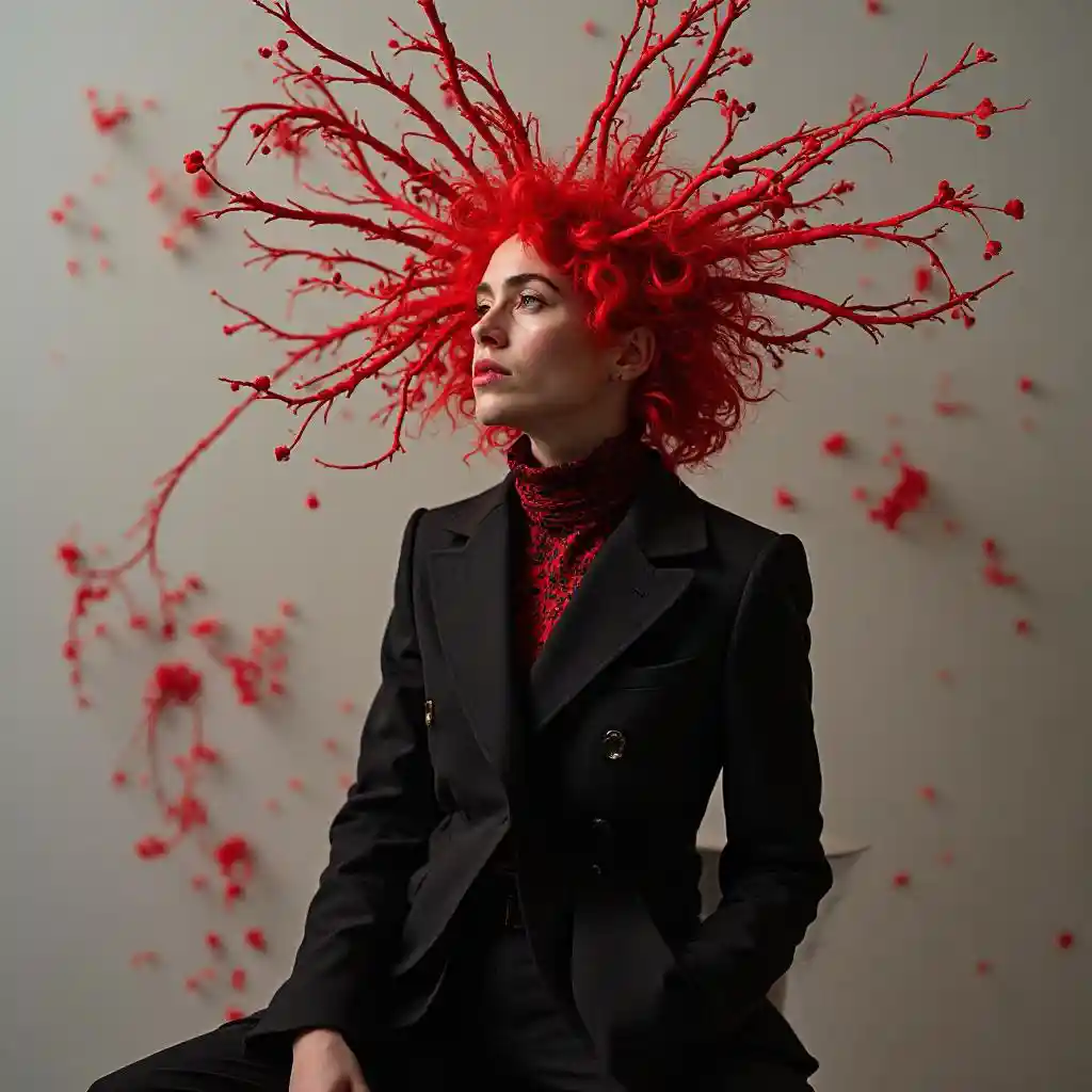 AuroraA cabeleireira sueca Mara Senilin, num fato escuro, com fios vermelhos, formas inspiradas na natureza, Patrick Kelly, Jeeyoung Lee, wetcore, Jocelyn Hobbie. 0 - de estilo bruto