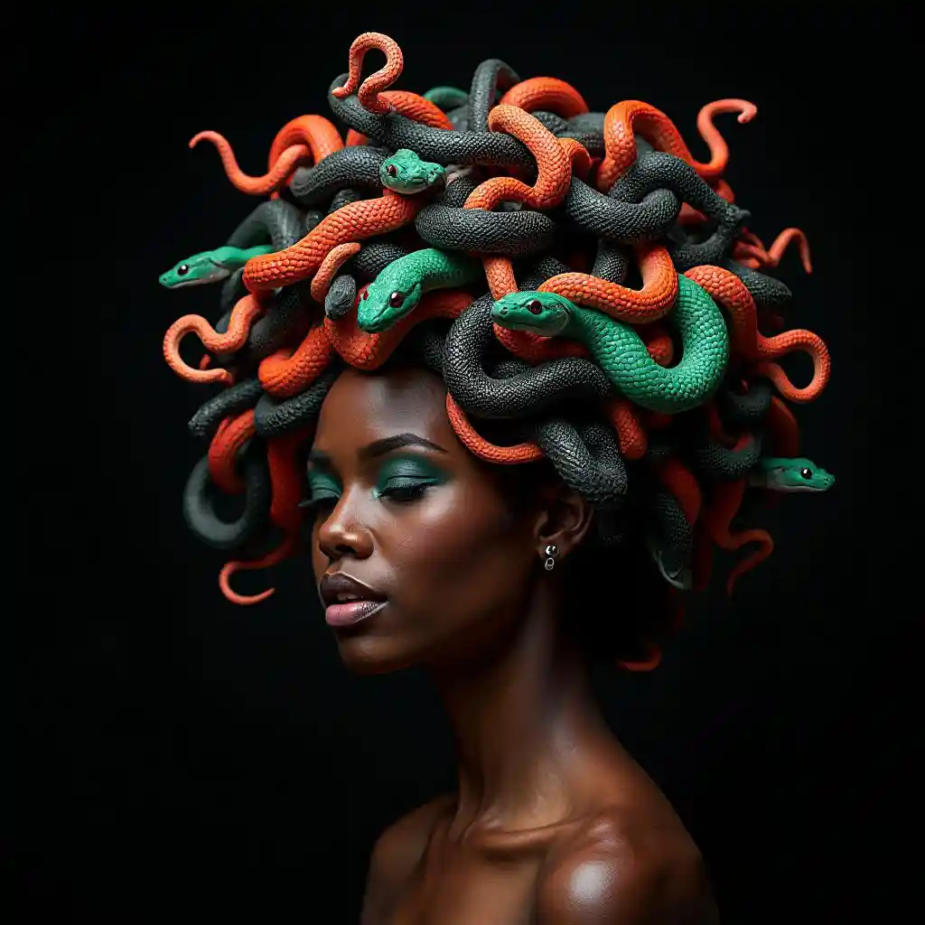 EthanUma bela medusa negra com quantidades copiosas de cobras coloridas em sua cabeça de fundo preto