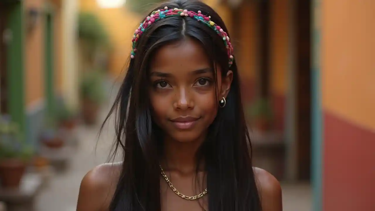 Uma bela rapariga negra com cabelo preto longo e reto ela tem uma faixa de cabeça em um ambiente mexicano foto hiper realista