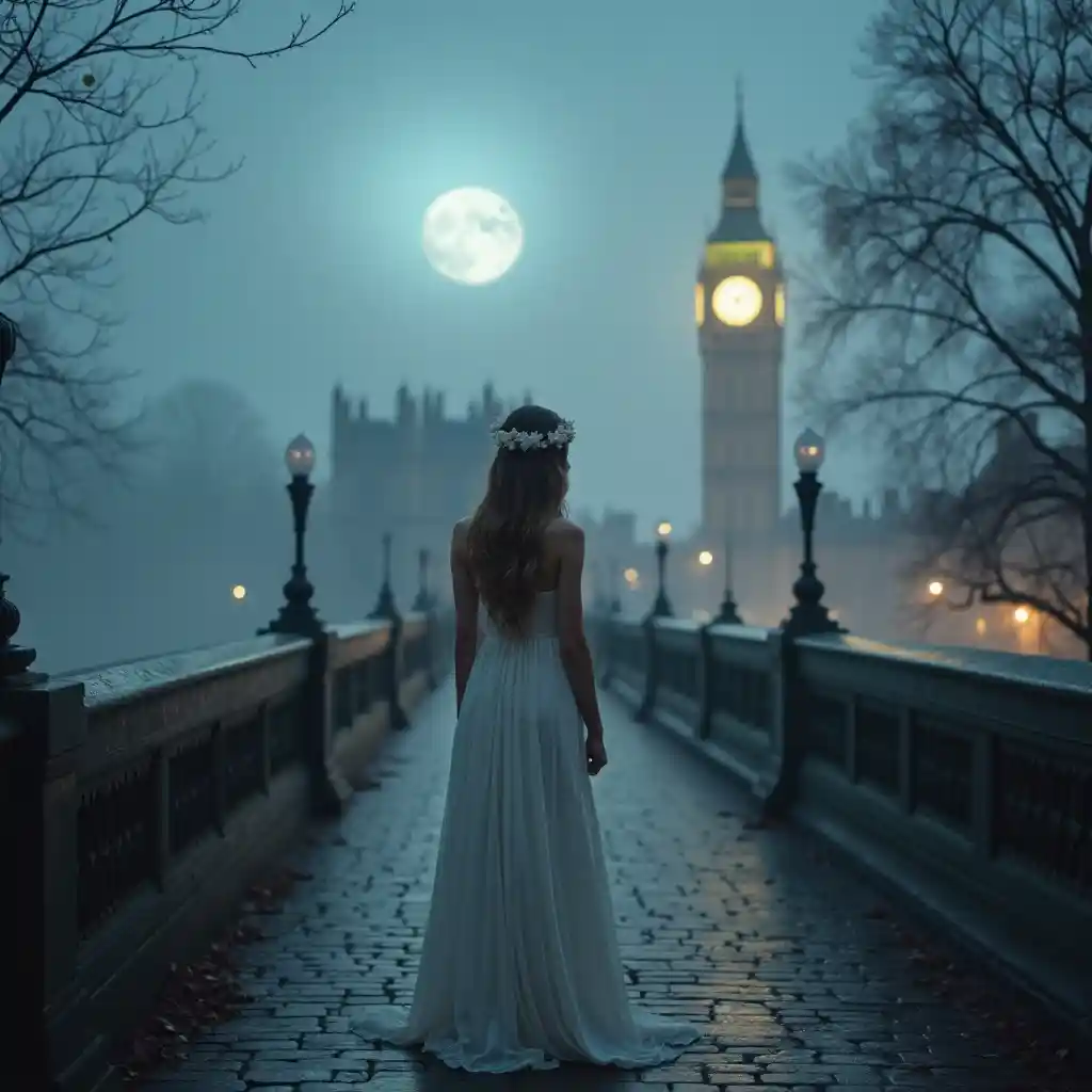 Uma cena tranquila se desenrola numa ponte nebulosa, onde uma jovem está de costas para o espectador, olhando para a icônica torre Big Ben iluminada contra o céu da noite. Vestida com um vestido branco e adornada com uma delicada coroa de flores, seu cabelo longo cai em cascata pela espalda, misturando-se com o ambiente etéreo da noite. A lua baixa lança um brilho prateado, aumentando a neblina que envolve o ambiente e acrescentando uma qualidade de sonho ao momento. O caminho sob seus pés, alinhado com um padrão de pedra, reflete restos de folhas de outono, enquanto árvores nuas estão sentinel ao longo da ponte, criando um contraste surpreendente contra as leves luzes da cidade distante. O clima geral é sereno, mas assombroso, evocando uma sensação de saudade e mistério dentro deste cenário encantador.