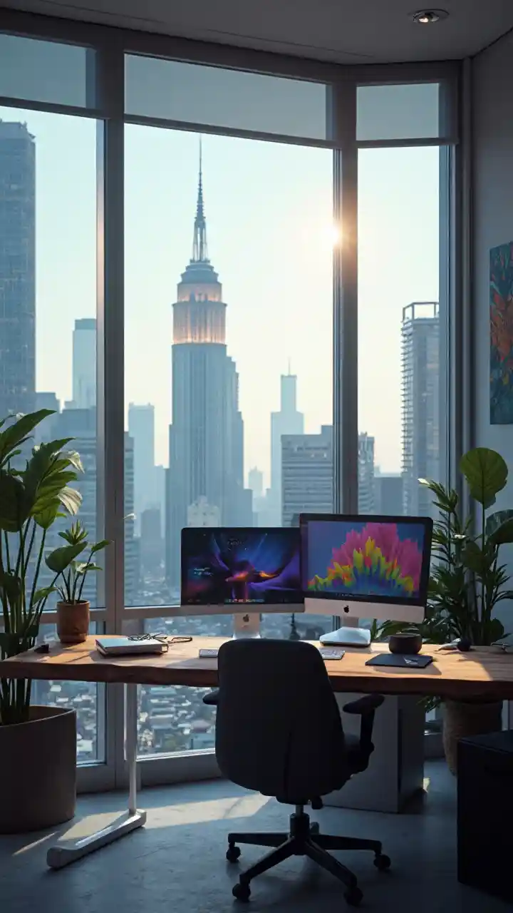 Escritório contemporâneo com bandeira do orgulho e arranha-céus