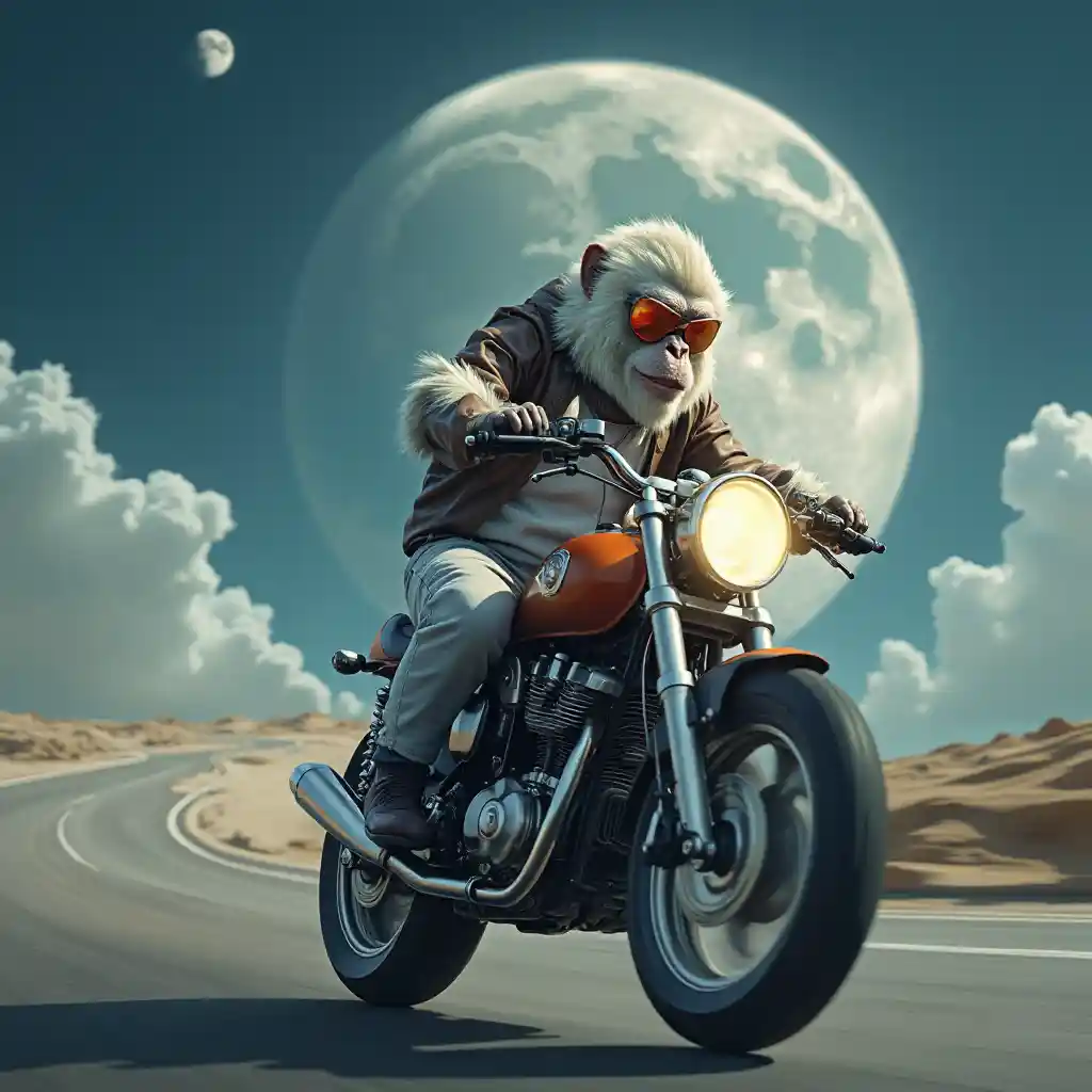 O Macaco Branco montando uma motocicleta na Lua
