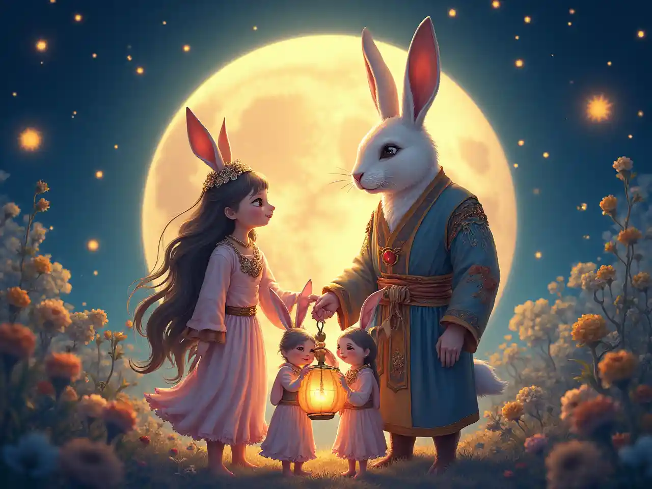 "Visualize uma família celestial vivendo num reino mágico, iluminado pelo brilho constante de uma lua majestosa. Imagine uma mãe humana, etérea e radiante, de pé ao lado de seu companheiro de coelhos encantado, ambos adornados com roupas cósmicas. São os orgulhosos pais de seus filhos mestiços únicos, que combinam cabeças humanas com orelhas de coelho e têm corpos que são uma mistura harmoniosa de ambos os pais. Coloque esta família mágica no fundo de uma lua iluminadora, rodeada por elementos fantásticos como lanternas flutuantes, estrelas cintilantes e flora mística. Capture a alegria e o amor nos rostos de cada membro da família enquanto eles celebram um festival especial. Para sinais visuais: Mãe Humana: Elegante e radiante, talvez segurando um artefacto mágico. Pai Coelho: Ereto, do tamanho de um homem, vestido com trajes cósmicos, segurando uma lanterna imersa com a lua. Crianças: Uma deliciosa mistura dos pais, com rostos humanos com orelhas de coelho, nariz de coelho e corpos híbridos.