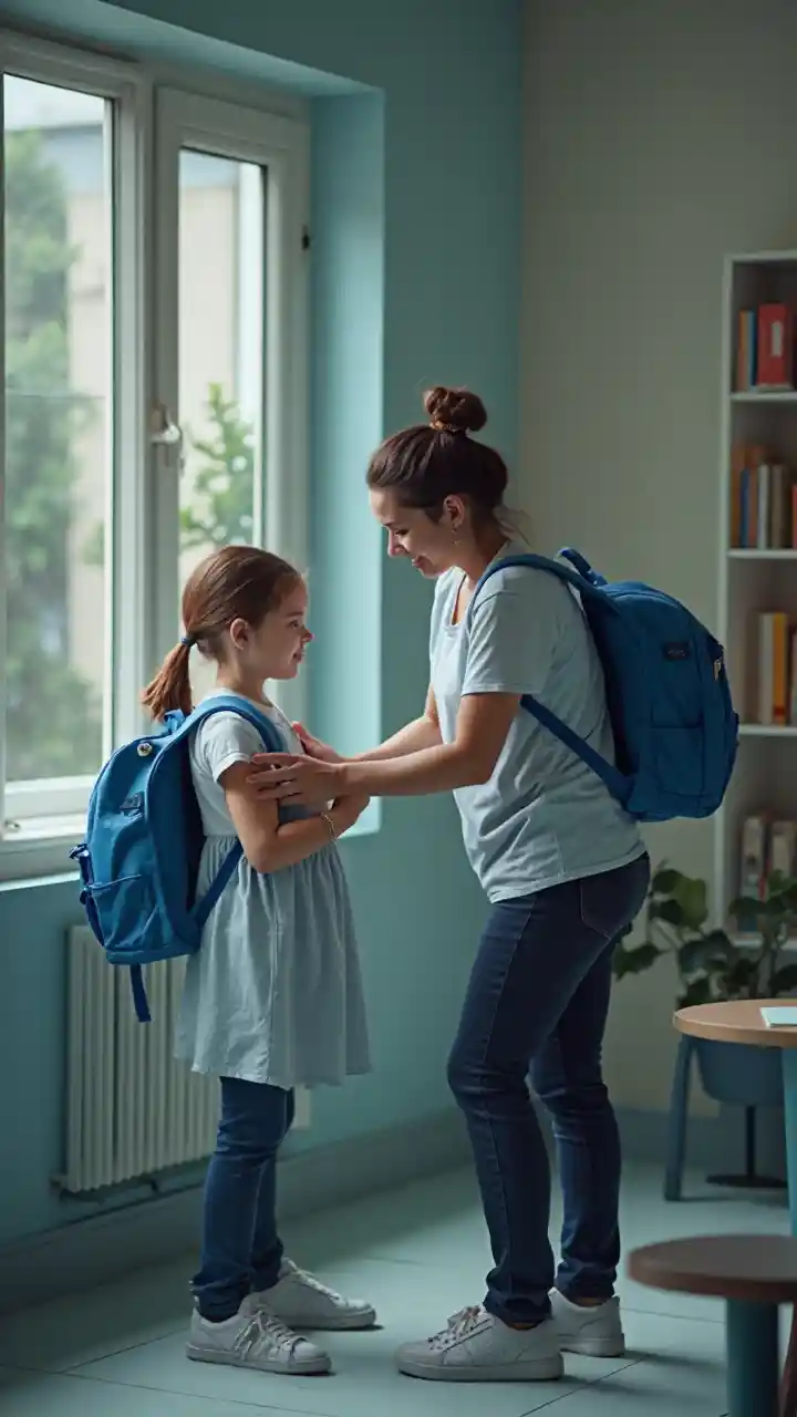 JackUma imagem de uma mãe preparando sua filha para a escola em tons de azul