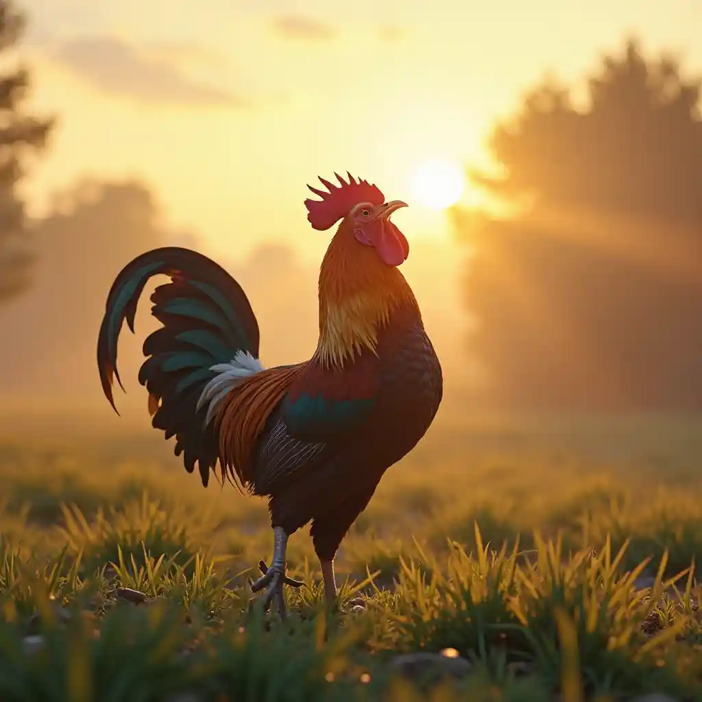 belo galo fotorrealista cantando de manhã lá fora, belo céu matinal
