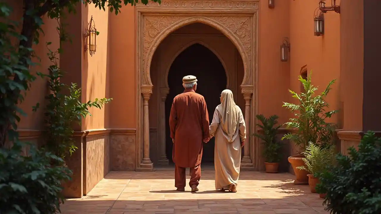 belas cores naturais, portas em estilo árabe de Marraquexe, iluminação deslumbrante do céu, perspectiva serena do corredor, detalhes ornamentais da porta, tons quentes e de terra, brilho suave que cria sombras dramáticas, vegetação exuberante ou paredes de textura suave que enquadram a cena, atmosfera envolvente cativante, humor convidante e encantador, arte ultra-detalhada, composição elegante, obra de alta qualidade. Pode colocar um homem e uma mulher muito velhos nas fotos mas não pode ver os rostos. São um casal marroquino muito tradicional os velhos usam como o vestido longo marroquino e a mulher também e a cabeça está coberta você não pode ver os rostos