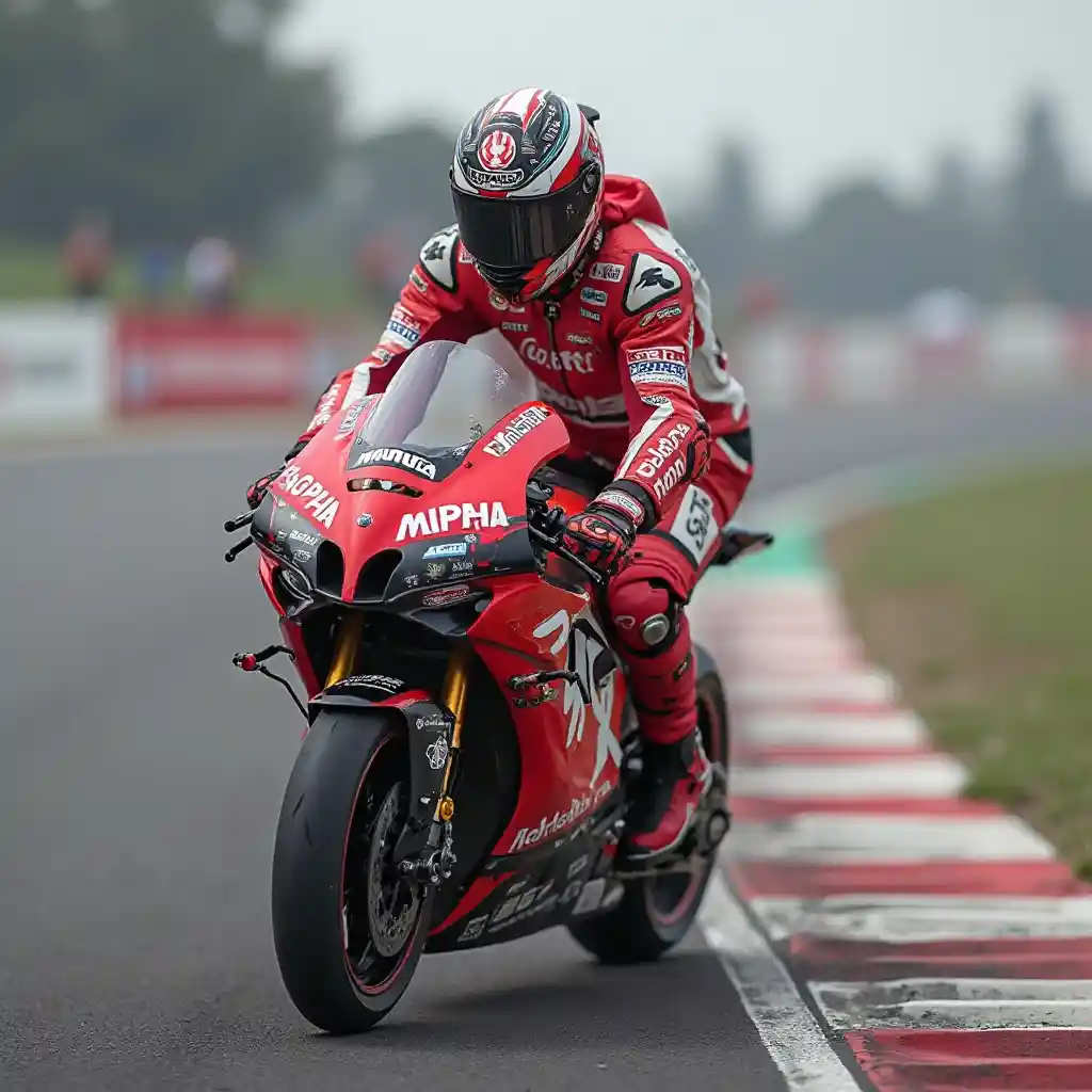 retrato de motociclista em uma bicicleta, cores vermelhas, no fundo da pista de corrida