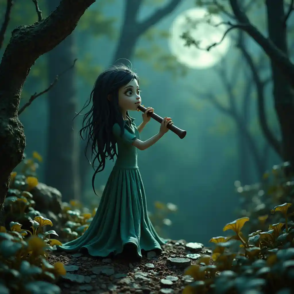 Uma rapariga fantasma a tocar flauta numa floresta mística