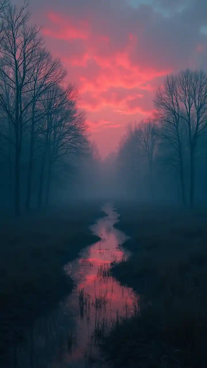 KittyImagem de uma floresta azul escuro com grama úmida que refletem um céu vermelho com nuvens
