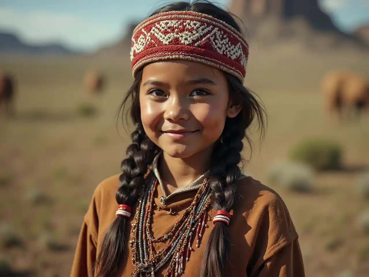 Uma mulher nativa americana de 10 anos de idade, vestida de nacional