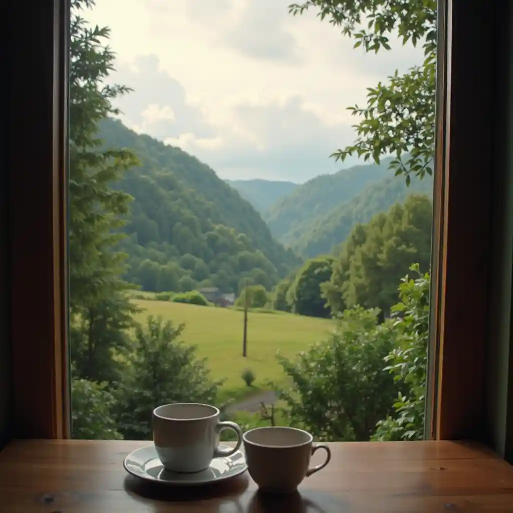 LincolnVista impressionante da natureza da janela da casa, juntamente com uma caneca de café na mesa que está dando um " olhar " impressionante para seus espectadores