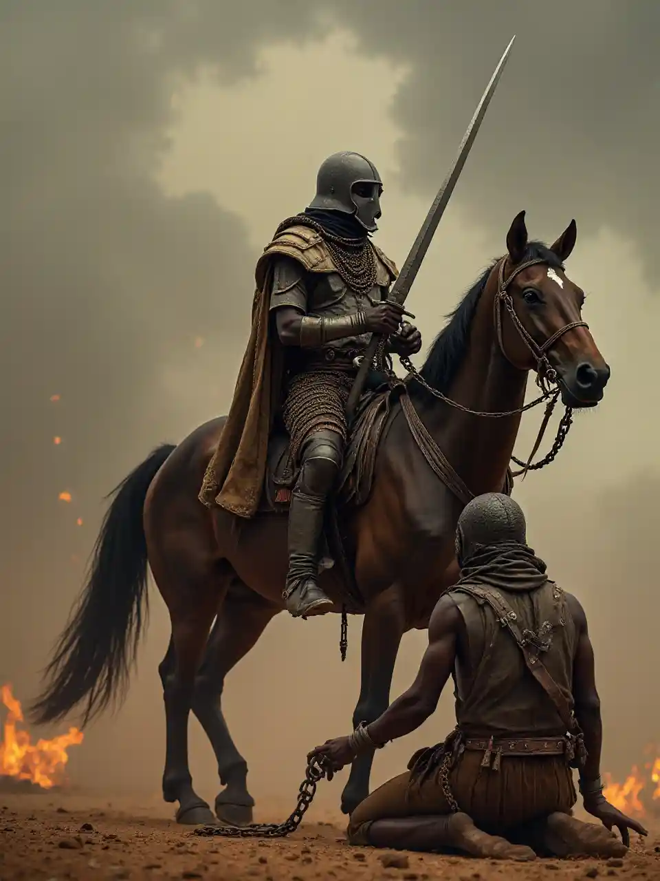 Gerencie uma imagem realista de um africano preocupado da Nigéria que tem 1,80 m de altura no seu cavalo preto com a sua espada de fogo este seu guarda e seus prisioneiros que foram capturados ajoelhados com cadeia nas mãos