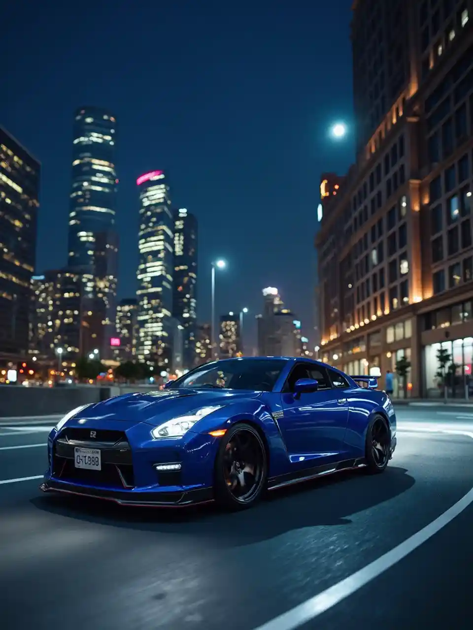 Uma cidade noturna impressionante com um Nissan GTR 34 azul