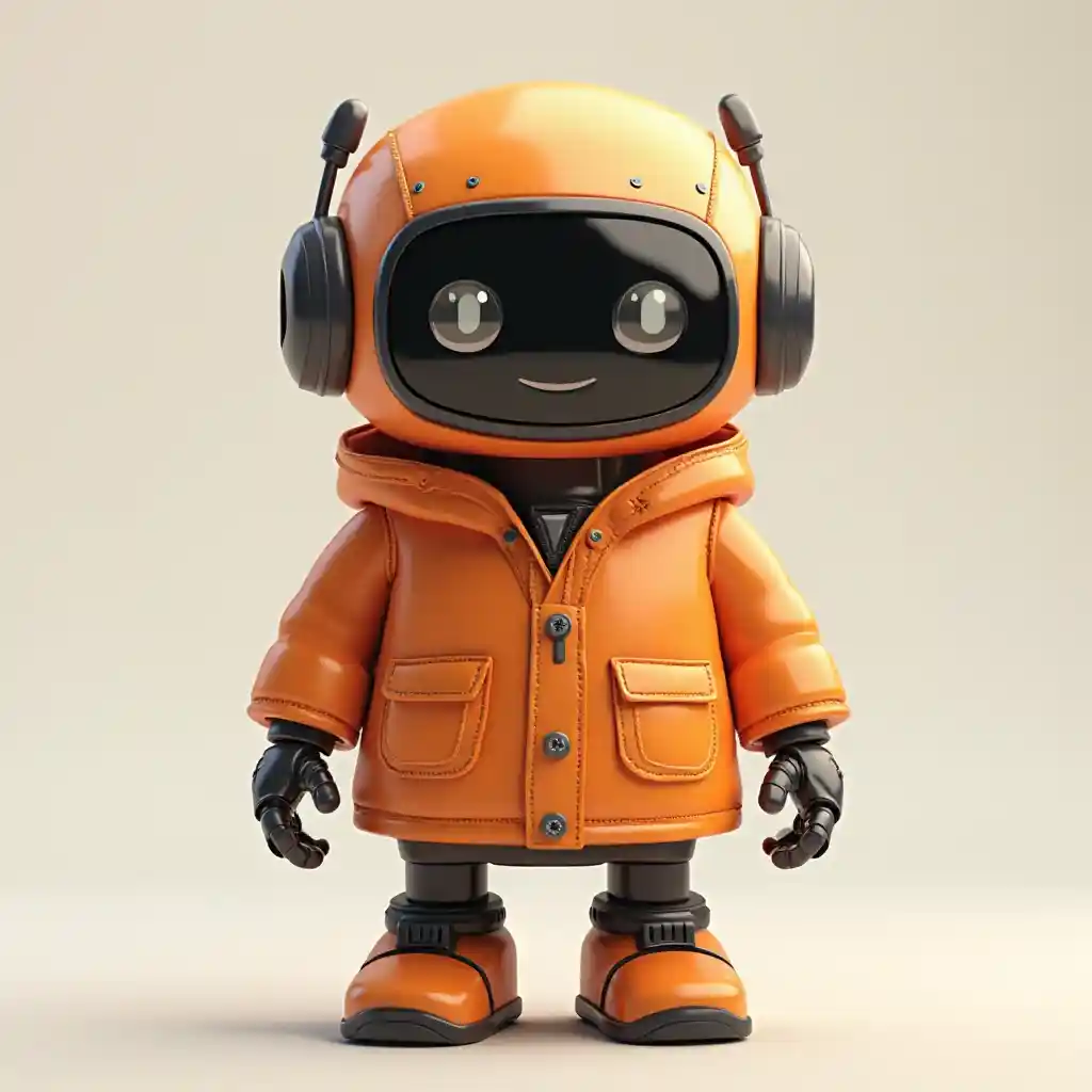 Orange and black AI robot, short and cute, simple 3d model, wearing jacket and glasses
