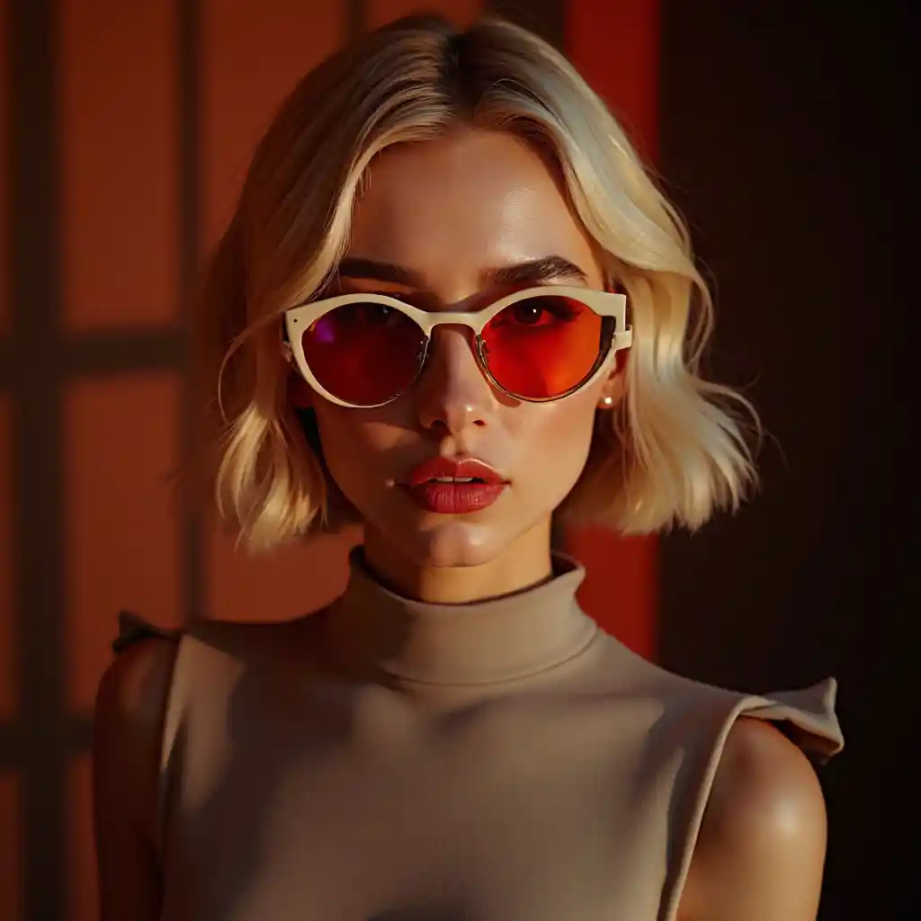 Modelo de pele clara, vestido de pescoço alto, iluminação de contraste, óculos de sol brancos com lentes vermelhas-laranja, lábios vermelhos, cabelo louro, fundo escuro com raios vermelhos-laranja, modelo de moda, capa de revista, fotografia profissional,