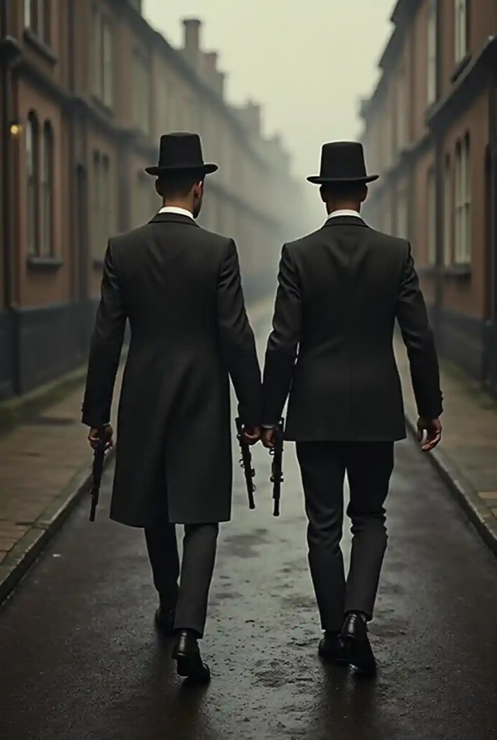 Thomas Shelby, ele e o amigo dele andam pela rua com armas nas mãos
