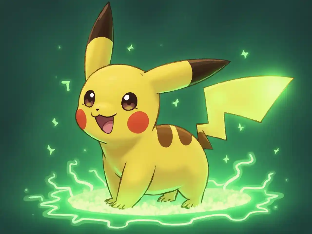 Pichu rodeado por faíscas elétricas verdes que vêm da sua cauda.