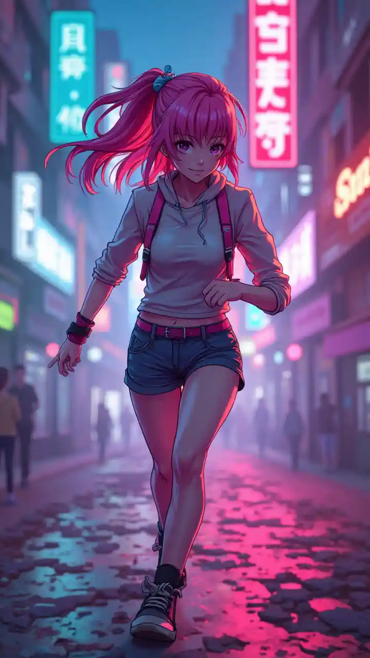 IsabellaNeon anime gamer asiática menina com cabelo rosa fugindo de uma explosão nuclear